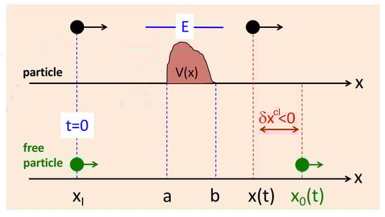 where is the trajectory with (see Figure 2). Indeed, if both particles are launched simultaneously with equal initial momenta from the same initial position, , we have , where . Both particles cross the region since . By the time the particle slowed down by a barrier reaches , its faster free-moving counterpart will lie ahead by , where is the duration the free particle spends in the region. The difference in positions can, therefore, be used to evaluate the defined earlier in Equation (2):