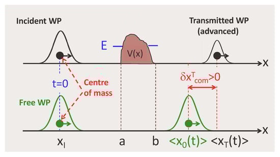 A quantum analogue of Figure 2: classical particles are replaced by wave packets, whose centres of mass are used as the reference points. The advancement, or delay, of the transmitted particle results from the interference between all virtual spatial shifts provided by the potential (cf. Equation (18)).