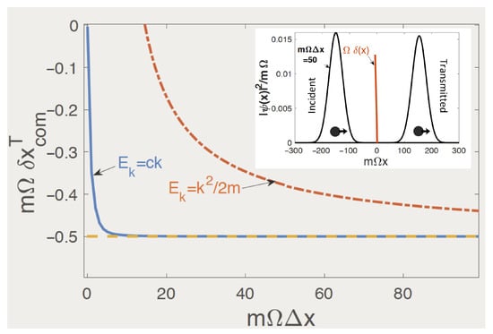equals the Eisenbud–Wigner–Smith time delay, multiplied by the particle’s velocity v. There is no momentum filtering (cf. Equations (28) and (29)), since all momenta are perfectly reflected at the origin. As in the previous examples, a zero-range well () advances the scattered particle, while a zero-range barrier delays it.