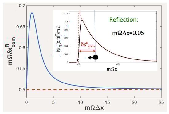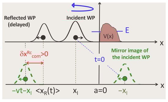 The position of a quantum particle, reflected by a potential , is compared with that of a free particle launched in the opposite direction from . The particle is said to be delayed by the potential if its COM lies to the right of the COM of the freely propagating WP, or advanced if the opposite is true (cf. Equation (33)).