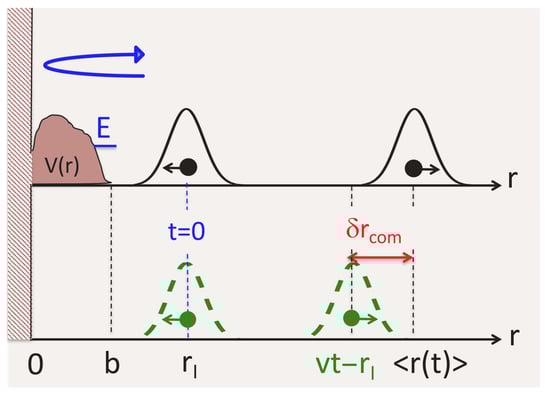 To obtain a quantum analogue of the procedure described by Equation (4), one can replace classical particles by wave packets (WPs) and evaluate the distance between their centres of mass (COM), as shown in Figure 3.