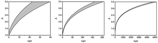 For any fixed value of ℵ, real solutions only exist in certain intervals of . This is shown in Figure 1, where the region of existence of real solutions (shaded areas) of the system of Equations (60)–(62) is depicted for several values of the deformation parameter . The case (not reported in the figure) corresponds to the horizontal line passing for . In this case, -entropy becomes 1-additive for any pdf.