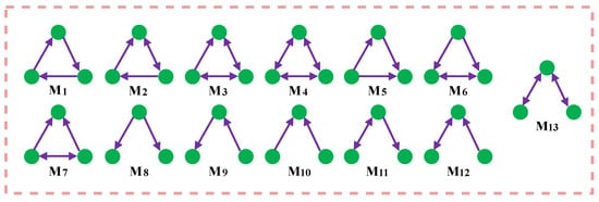Milo et al. revealed the structural principles of complex networks by defining network motifs. Network motifs are network subgraphs composed of three or more nodes, which are fundamental in constructing complex networks and play a crucial role in network functionality [8,23]. Figure 1 presents 13 different three-node network motifs in a directed network. For instance, the feed-forward loop (M5 in Figure 1) is vital in transcriptional regulatory networks and social networks, while the open bidirectional wedge (M13 in Figure 1) is critical in central brain structures.