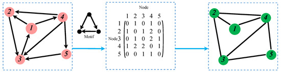 Using specific network motifs, corresponding higher-order networks can be generated based on the original network. The specific generation process is illustrated in Figure 2. Given a network and a motif, the adjacency matrix can be generated by computing the number of times two nodes appear together in the motif. Based on this adjacency matrix, an undirected higher-order network can be constructed. Exploring the characteristics of higher-order networks can help researchers identify essential nodes within the network and develop strategies to protect these critical nodes through specialized means [24]. Furthermore, higher-order networks can be employed to study the spread of pollutants in the air, providing valuable insights for environmental governance [25]. Therefore, higher-order networks play a significant role in complex networks, and studying them allows for a deeper understanding of networks’ properties and dynamic behaviors [20,26].
