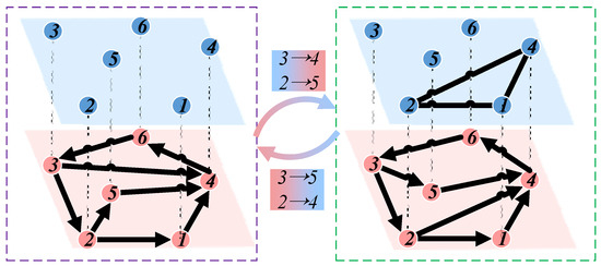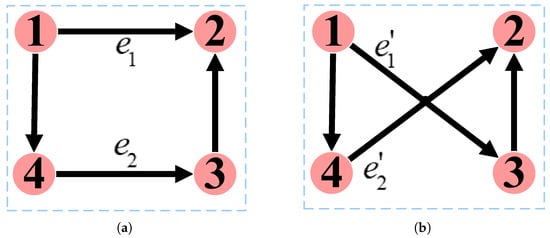 Edge rewiring refers to disconnecting edges in a network and then re-establishing the same number of edges according to certain rules. As shown in Figure 6a, the network contains two edges and , where , . Subsequently, these two edges are disconnected, and a new edge is added between nodes and , and another new edge is added between nodes and . These new edges are denoted and , respectively. Figure 6b illustrates the resulting network after edge rewiring. It is important to note that this method does not alter the node’s in-degree and out-degree. For instance, the in-degree of node 1 remains 0, while the out-degree remains 2.