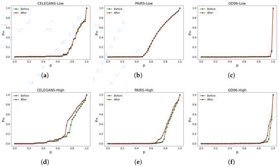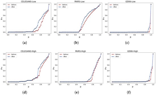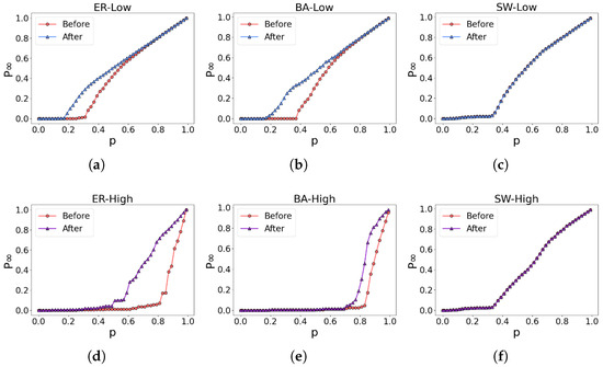 The experimental results are depicted in Figure 9. In the ER network and BA network, both the low-order and higher-order networks demonstrate improved robustness, as evident in Figure 9a,b,d,e. However, in the case of the SW network, the network’s robustness remains relatively unchanged, as illustrated in Figure 9c,f.