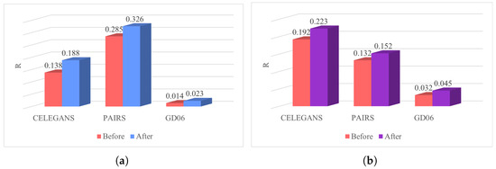 The partial visualization results of the experiments are shown in Figure 11a,b. By incorporating the robustness of both the low-order and higher-order networks as optimization criteria, the ratio of edge rewiring is controlled at . As a result, CELEGANS, PAIRS, and GD06 exhibit specific improvements in low-order and high-order networks.