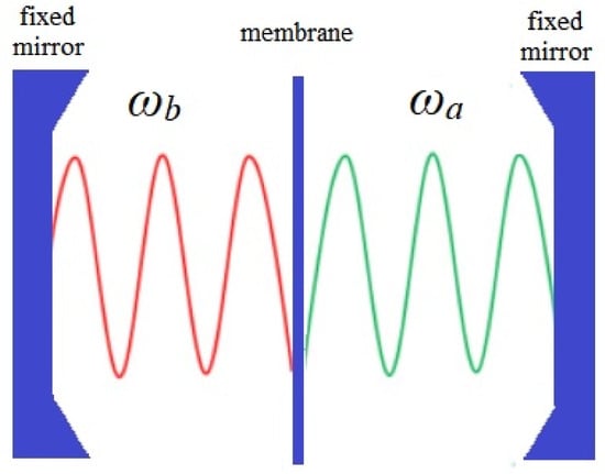 In this work, we theoretically study a model for a high quality optical cavity with fixed mirrors and an elastic dielectric membrane within it, as depicted in Figure 1. Two electromagnetic modes are produced inside the cavity, one on each side of the membrane. As the membrane’s transmission amplitude is not null, the modes can exchange photons. Additionally, the radiation pressure causes the membrane to vibrate, affecting the frequencies of the modes on each side [26,27], as a consequence of parametric coupling.