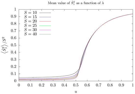 Mean value of the operator (i.e., squared photon imbalance operator) as a function of u in the ground state of the Hamiltonian of Equation (3) for several values of the quantum number S: 10 (black), 15 (blue), 20 (red), 25 (green), 30 (magenta), and 40 (brown). For all curves, and .