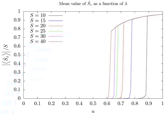 Modulus of mean value of the operator (photon imbalance) as a function of u in the ground state of the Hamiltonian of Equation (3) for several values of the quantum number S: 10 (black), 15 (blue), 20 (red), 25 (green), 30 (magenta), and 40 (brown). For all curves, , and .