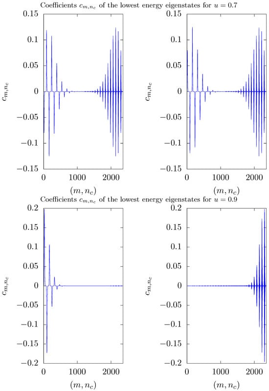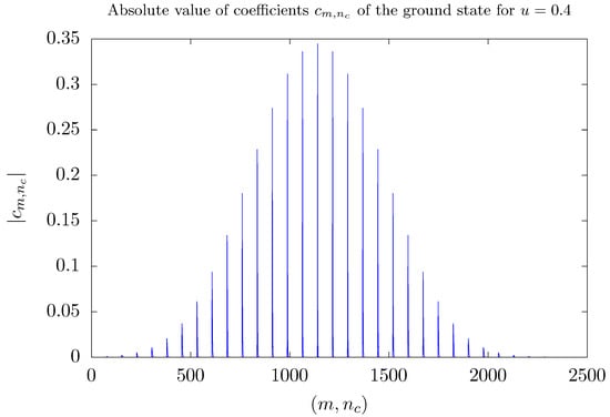The abrupt changes in curves of Figure 3 can be understood as a result of the diagonalization process. They occur for values of the coupling parameter that depends on S, and is greater than the value , for which the two lowest energy eigenstates become degenerate, i.e., . In this case, the two lowest energy eigenstates and define a two-dimensional eigensubspace, . Any state belonging to can be picked up as the ground state by the diagonalization process. Therefore, the abrupt changes observed in curves of Figure 3 occur because, after the diagonalization process, a state that describes one of the two modes preferentially occupied is chosen in . This can be better understood observing the distribution of the coefficients given by the expansion of the ground state in the computational basis. Figure 4 and Figure 5 show such a distribution for three different situations with . To this end, states of the computational basis are arranged in an ascending order as follows: . Hence, coefficients associated with negative values of m appear on the left side of the graphs, while coefficients assigned to positive values of m appear on the right side. Before degeneracy, as shown in Figure 4 for , the coefficients are symmetrically distributed along the entire horizontal axis, exhibiting more significant values on the central part, where .