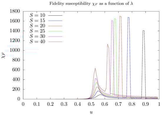 Fidelity susceptibility between ground states of the Hamiltonian of Equation (3) as a function of the parameter (u) for several values of S. We use as truncation of the maximum number of phonons considered in our simulations. Here, . Different colors were attributed to different values of S: 10 (black), 15 (blue), 20 (red), 25 (green), 30 (magenta), and 40 (brown).