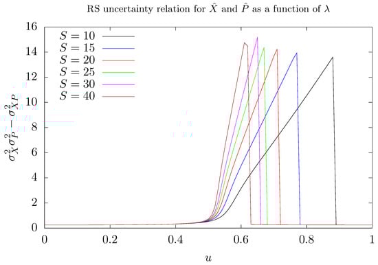 In order to shed some light on the role of fluctuations on the model studied here, we evaluate the Robertson-Schrödinger (RS) uncertainty relation [58,59] for the membrane’s observables and as the coupling parameter is varied for different values of S. In the Dicke model, fluctuations have been used as an indicator of chaos [60] and of quantum phase transition in the mean field approximation [61]. The variances of these observables were evaluated in the ground state of the Hamiltonian . The results are presented in Figure 7. RS uncertainty is given by