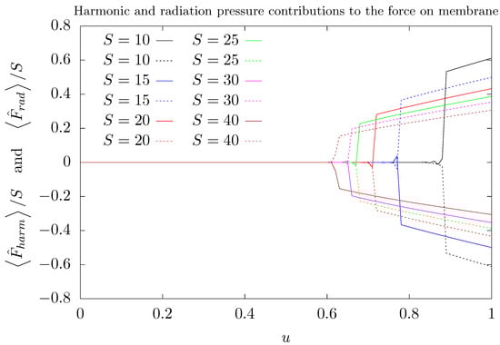 Mean values of the two contributions to the force on the membrane as functions of the parameter (u) for several values of S in the ground state of the Hamiltonian of Equation (3): (harmonic contribution—continuous line) and (radiation pressure contribution—dashed line). We use as truncation of the maximum number of phonons considered in our simulations. Here, . Different colors were attributed to different values of S: 10 (black), 15 (blue), 20 (red), 25 (green), 30 (magenta), and 40 (brown).