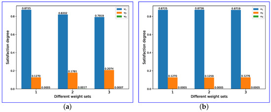 The experimental results, depicted in Figure 5, reveal that the priority order of satisfaction level remains consistent despite significant fluctuations in both indicator weights (Figure 5a) and mission importance (Figure 5b). These findings strongly support the stability and robustness of the introduced PHFET model under various weighting scenarios.