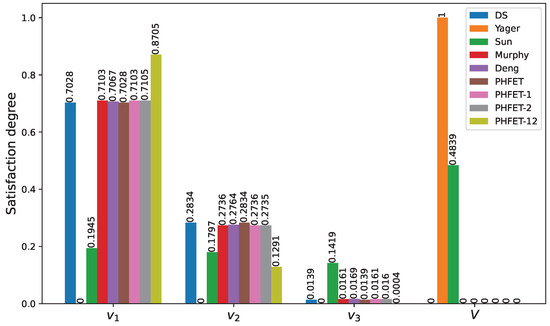 According to the distance-based generation method proposed in the previous section, PHFBPAs of scheme 1 were obtained. Furthermore, to facilitate comparison with other methods, the adjustment parameter in Equation (31) takes the values of 1 and 1, with a probability of for each value. The final fusion results of the evidence from all indicators are depicted in Figure 6.