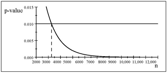 The large n problem. This arises when a practitioner uses conventional significance levels, say , for very large sample sizes, say 10,000. The source of this problem is that for a given as n increases the power of a test increases and the p-value decreases, giving rise to over-sensitive tests. Fisher [24] explained why: “By increasing the size of the experiment [n], we can render it more sensitive, meaning by this that it will allow of the detection of … quantitatively smaller departures from the null hypothesis.” (pp. 21–22). Hence, for a given there is always a large enough n that would reject for any discrepancy (however small, say ) from a null value ; see Spanos [25].