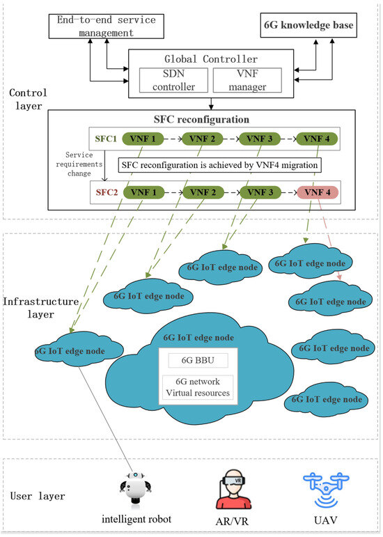 Consider the 6G IoT scenario. Service requirements are satisfied by SFC orchestration. SFC orchestration is complemented by global control with the help of the 6G knowledge base. When the device produces a service request, it is assigned to the closed-edge node and communicates with the top-level SDN controller and NFV manager. The VNF manager complements the VNF orchestration, forming an ordered set of VNFs, that is, the SFC deployed policy. Finally, the policy is issued to the infrastructure layer to deploy the network functions to meet the service requirements. And when the service requirements change, SFC can be reconfigured through VNF migration, for example, VNF is migrated from one edge node to another edge node.