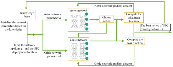 The framework of the KA-ACPPO algorithm is shown in Figure 2. Input the current network topology G and the VNF deployment state, then the Actor network factor and the Critic network factor are initialized according to the module of the 6G knowledge base. The historic policies in the module knowledge base are updated based on the SFC reconfiguration policy. The Actor network is responsible for selecting VNF migration actions, while the Critic network evaluates the value of each action. The gradient descent method is used to update the parameters of the Critic network and the Actor network, and the optimal SFC reconstruction strategy can be denoted as: