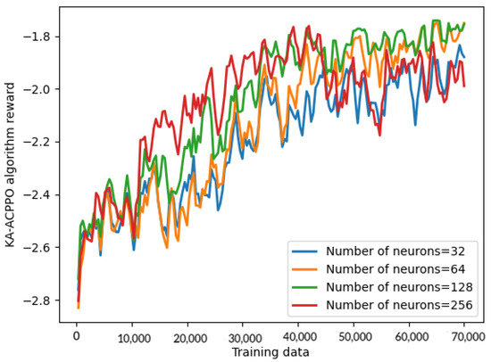 Figure 3 shows KA-ACPPO algorithm rewards for different number of neurons. It can be seen that, as the number of neurons increases, the reward of the KA-ACPPO algorithm also increases. The reason is that increasing the number of neurons can improve the representation ability of neural networks, enabling them to better learn and fit complex functional relationships, and enable the network to better express the complex relationships between states and actions, thereby improving rewards. However, increasing the number of hidden layer neurons can increase the complexity of the model and may lead to a slower training process. Therefore, when selecting the number of hidden layer neurons, it is necessary to balance training efficiency and increasing rewards. Considering training efficiency and rewards comprehensively, the number of neurons for the KA-ACPPO algorithm is determined to be 128 in the following simulation in this paper.