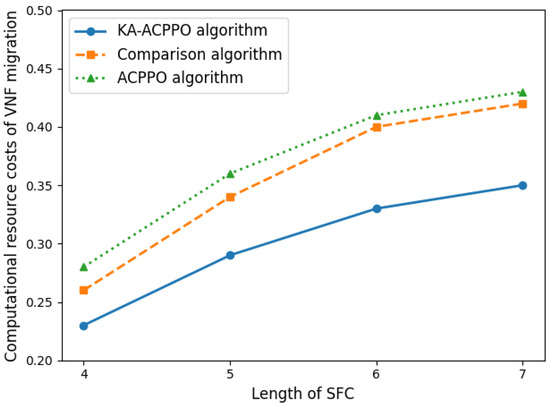 Figure 5 shows the computing cost for VNF migration using different algorithms, which is related to Equation (4). The length of SFC affects the computational resource cost of VNF migration from two aspects: the current usage of computing resources of edge nodes, and the number of VNF migrations. As the length of SFC increases, the number of VNFs per SFC increases, and the current usage of edge node computing resources becomes more complex. With the goal of minimizing reconstruction costs, the number of VNF migrations should be controlled while migrating VNFs that use fewer computing resources. From the figure, it can be also observed that as the length of SFC increases, the computational resource cost of VNF migration for all three algorithms increases. The computational resource cost of VNF migration using the proposed KA-ACPPO algorithm is always lower than the other two algorithms, ultimately controlling the computational resource cost of VNF migration at .