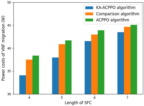 Figure 6 shows the power costs of VNF migration for different algorithms, which is related to Equation (6), and the comparison algorithm is Reinforcement Learning (RL)-based VNF deployment scheme proposed in [16]. The power cost of VNF migration is related to the usage of network node computing resources. Therefore, the length of SFC also affects the power cost of VNF migration in two aspects: the current usage of edge node computing resources and the number of VNF migrations. As the length of SFC increases, the number of VNFs per SFC increases, and the computing resources of the network edge nodes currently used increase, The power consumption increases accordingly. Considering that VNF migration may change the working mode of edge nodes, with the goal of minimizing reconstruction costs, the number of VNF migrations should be controlled to minimize the additional power consumption caused by such changes. From Figure 6, it can be observed that as the length of SFC increases, the power cost of VNF migration for all three algorithms increases. The power cost of VNF migration for the KA-ACPPO algorithm is always lower than the other two algorithms.