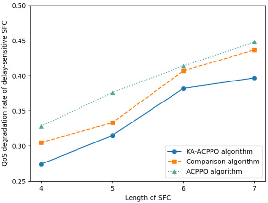 Figure 7 shows the QoS degradation rates, which is related to Equation (18), of delay-sensitive SFC requests using different algorithms. According to Formula (18), the QoS degradation rate of delay-sensitive SFC is defined as the proportion of additional delay caused by excessive downtime to the total end-to-end delay. The length of SFC affects the QoS degradation rate of delay-sensitive SFCs from two aspects. Firstly, as the length of the SFC increases, the total end-to-end latency also increases. Secondly, as the length of the SFC increases, the number of VNF migrations per SFC may also increase. The negative impact of migration latency and downtime on the QoS of delay-sensitive SFC will also increase. From Figure 7, it can be observed that as the length of the SFC increases, the QoS degradation rate of the delay-sensitive SFC of all three algorithms increases. The QoS degradation rate of the delay-sensitive SFC of the KA-ACPPO algorithm is always lower than the other two algorithms, and the QoS degradation rate of the delay-sensitive SFC is ultimately controlled at 39%.