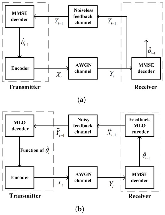 - Schalkwijk, J.; Kailath, T. A coding scheme for additive noise channels with feedback–I: No bandwidth constraint. IEEE Trans. Inf. Theory 1966, 12, 172–182. [Google Scholar] [CrossRef]