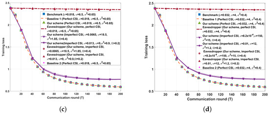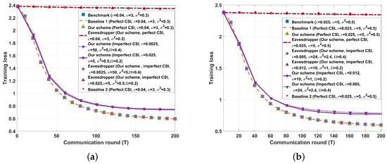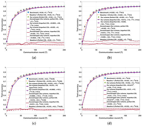 - Baseline 2 (Frequency division multiple access (FDMA)-based WHFL with artificial noise (AN) [29]): In the FDMA-based WHFL system with AN, FDMA is employed to transmit gradient data from edge servers to the cloud server, targeting a bit error ratio of . Additionally, AN is added to the transmitted signals to prevent eavesdroppers from obtaining the true gradient data.
