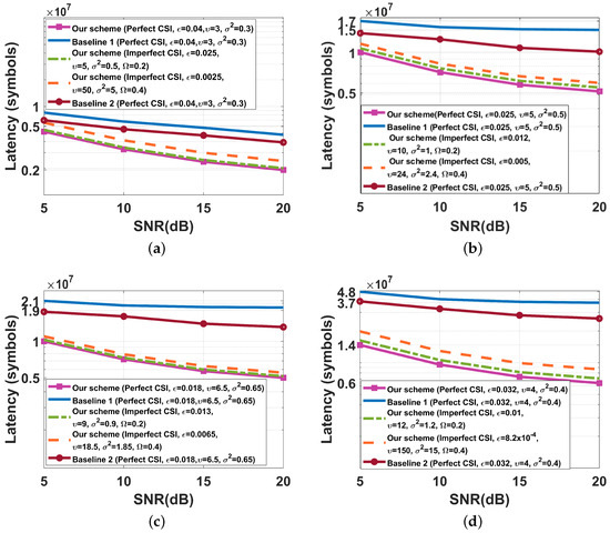 | Baseline 1 [26,28] (Perfect CSI) | (, , ) | (, , ) | (, , ) | (, , ) |