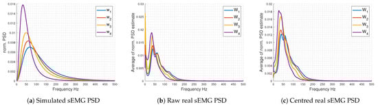 A total of 50 realisations of synthetic sEMG are performed for each parameter pair. The sampling frequency is fixed at 1000 Hz, and the sample number is 10,000. Figure 1a displays the expected synthetic sEMG PSDs for to , which closely resemble the PSDs of real sEMG signals acquired, as described in the subsequent subsection.