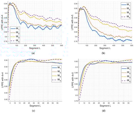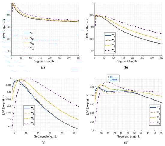 From Figure 2a,b, it is evident that the discrimination between LPPE curves for , , , and is better enhanced using . Additionally, the selection of L significantly impacts the LPPE measures, as shown in the zoom-in of Figure 2a,b, depicted in Figure 2c,d, respectively. Indeed, from these latter figures, we observe the presence of LPPE maxima and notice two main cases of LPPE behaviour regarding the L value in relation to these maxima: