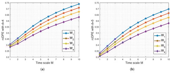 Given that each recorded sEMG signal comprises approximately 274,000 samples, we continue to calculate the rcDPE using OP lengths limited to and . Recall that these values also represent the embedding dimension for the rcDPE method. A range of scale values M from 1 to 10 in one-step increments was tested for rcDPE before encountering aliasing due to downsampling effects. It is worth noting that the particular scale results in a new sampling frequency of Hz, which is known to be suitable for a moderate contraction of the biceps brachii muscles with an equivalent bandwidth of 500 Hz [7,53,55].