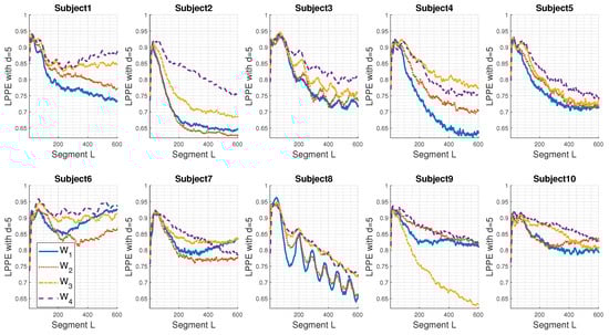 Figure 4 displays the individual LPPE measures of the real sEMG signals acquired under fatigue conditions ( to ) for the ten subjects considered.