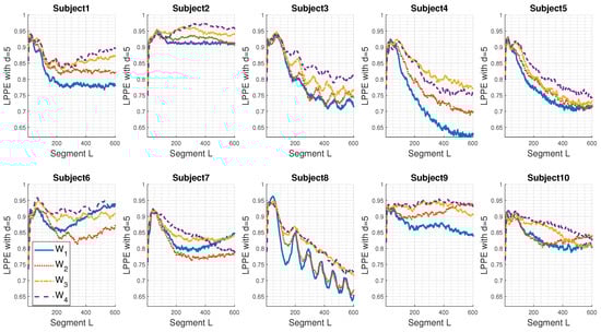As can be noticed from Figure 4, individuals present different LPPE shapes with respect to the segment length L. However, except for Subject 9, similar behaviours are observed for higher values of ms: the LPPE for and are close and are the lowest values. On the other hand, the LPPE for and are also close, with usually exhibiting the highest values. Subject 2 shows the biggest differentiation between the four conditions to , with a steady decrease in the LPPE. Additionally, we observe oscillations in LPPE values, such as those in Subject 8, which appear to be sinusoidal with a main period of approximately 100 ms.
