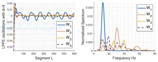 However, a key difference from the simulated sEMG signals is that the LPPE averages of real sEMG signals exhibit higher oscillations, which should be highlighted. Figure 7 depicts these oscillations for d = 4 and their spectra after trend removal, using the effective data-driven method Variational Mode Decomposition (VMD) [57]. Similar results are obtained using d = 5. We notice the presence of dominant frequency bands in these oscillations: