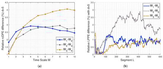 Relative absolute difference of (a) LPPEs and (b) rcDPE of real sEMG signals using pairwise comparisons of the fatigue steps -, -, and -. The sampling frequency is 1000 Hz. The relative absolute difference is calculated using , where is LPPE or rcDPE of step .