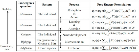 By leveraging these insights to combine progress in cognitive neuroscience with evolutionary and developmental perspectives in psychology, the brain can be reframed in terms of an evolved, hierarchically mechanistic mind (HMM): a (situated and embodied) complex adaptive system that actively minimises the variational free energy (and therefore entropy) of (far from equilibrium) phenotypic states via self-fulfilling action–perception cycles, which are mediated by dynamic interactions between hierarchically organised (functionally differentiated and differentially integrated) neurocognitive mechanisms [18,58]. This hypothesis connects most closely with evidence in network neuroscience that the brain instantiates a self-similar hierarchy [65,68,90], along with more recent claims in the active inference literature that the brain consists of hierarchically nested Markov blankets [91,92]. The HMM is distinctive, however, in that it places evolutionary dynamics front and centre by emphasising the causal role of species-typical adaptive priors—namely, neurophysiologically instantiated Bayesian beliefs about our characteristic phenotypic and environmental states that have been shaped by selection to ensure that our action–perception cycles keep us within the adaptive bounds of unsurprising states [18,58,93]. Such evolutionary priors arise from the reliable transmission of adaptive (surprise-reducing) policies from one generation to the next, extending from innate, genetically inherited priors sculpted by natural selection, through to developmentally-open prior expectations that depend on the repeated assembly of reliably recurrent ontogenetic resources that arise from reciprocal interactions between (epi)genetic processes canalised by natural selection, developmental processes that unfold over the life course and situational activities in species-typical, real-time environments [93]. In short, adaptive priors allow our generative models of the world to be sculpted adaptively by natural selection, reliably passed on from one generation to the next, and successively optimised by neurodevelopment and learning [18]. Meanwhile, the non-substantive process theory of active inference can be used to integrate ecobiopsychosocial dynamics across temporal and spatial scales, ranging from the evolution of our species through to the thoughts and actions of an individual in real time (see Figure 2).