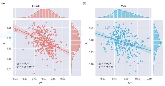 Relationship and regression results between H and . The correlation coefficient R was calculated between H and , and linear regression was performed, represented by a solid line. (a) Females. (b) Males.