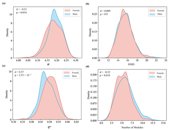 Comparison of the distributions of H, HMD, , and Number of Modules between females and males. For all figures, d is the effect size and p is the p-value of the two-sample t-test. (a) The kernel density of H for each sex. (b) The kernel density of the maximum depth of hierarchical organization for each sex. (c) The kernel density of for each sex. (d) The kernel density of the number of modules.