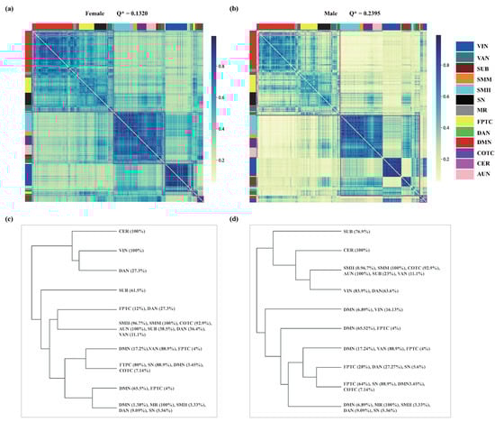 To assess the details of the modular difference between females and males, we constructed a co-classification matrix and applied hierarchical clustering to obtain the consensus partition for each sex (Figure 4a,b). Overall, the element value of the co-classification matrix is higher for females than males. This suggests that the modular structure in females is more stable than that in males. For the consensus hierarchical structure, females exhibit high inter-module co-occurrence, blurring the boundaries between modules and resulting in a low modularity value (). But this high co-occurrence probability is also pronounced within smaller modules, eventually giving rise to five modules at the optimal partition. In contrast, males show high intra-module co-occurrence and low inter-module co-occurrence, which results in a higher modularity value () than that in females. Due to the comparable co-occurrence probabilities between smaller modules like SUB and VIN, and larger ones formed by SMH, SMM, COTC, and AUN, they are grouped into one large module. We identify three modules for males.