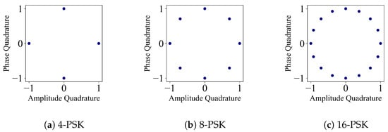 A coherent state in a particular ring has equal probability , and each ring has the same probability . Therefore, each coherent state has a probability of in the case of a discrete uniform distribution. M-APSK can also have non-uniform distributions [8,9]. M-APSK on the phase space is depicted in Figure 3.