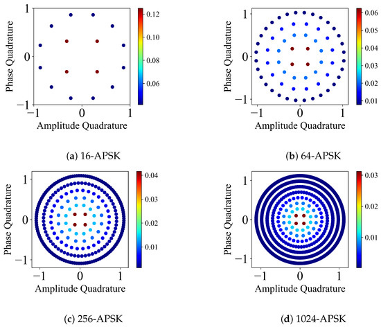 Phase space representation of 16, 64, 256, 1024-APSK protocols, . Colour bars indicate the probability of the coherent state for the particular protocol.