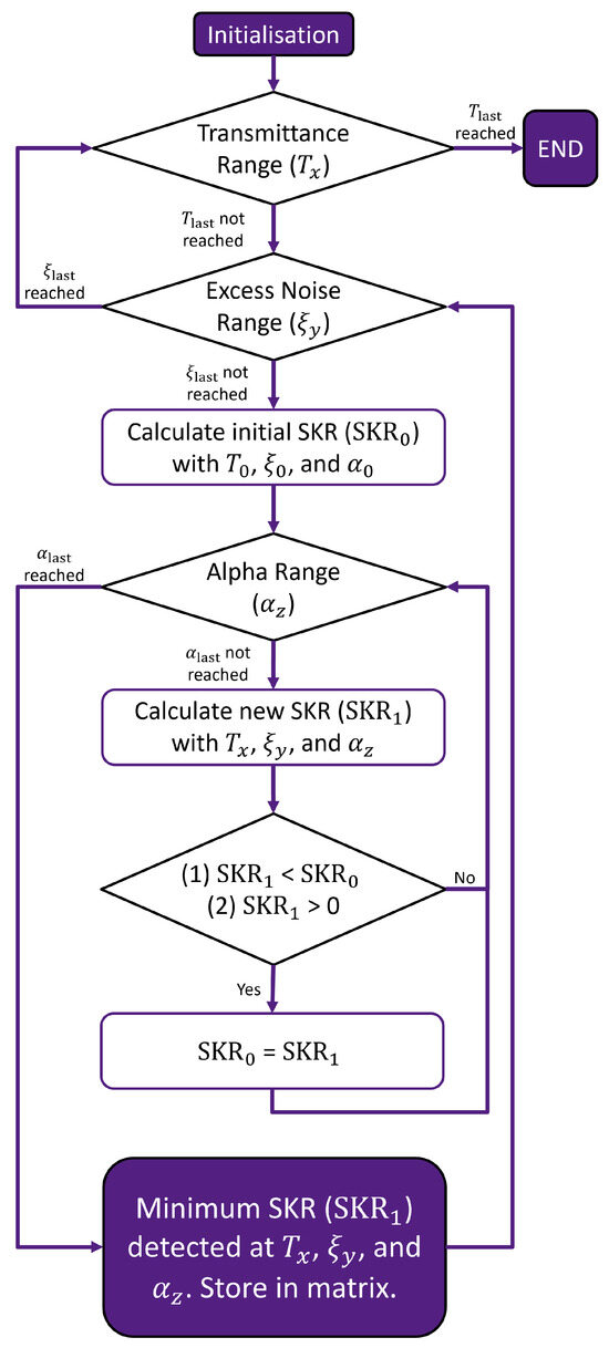 where is the new SKR within the range, and is the previous minimum positive SKR or the initial SKR value during the first iteration. Once the final value within the range is reached, the current minimum positive SKR for specific T, , and is stored in a matrix. The process is complete when a minimum positive SKR is found for each combination of T, , and . A three-dimensional surface can then be fitted with a polynomial.