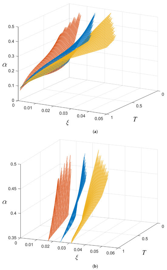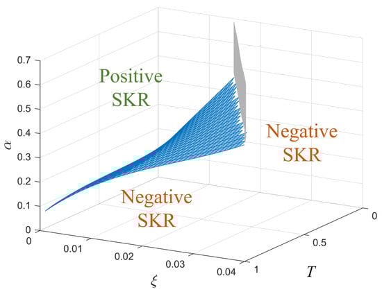 Figure 5 shows the discretised mesh with a surface fit representing the boundary for 16-APSK, identifying the regions of positive and negative SKR. Here, a protocol’s boundary shown in blue (in this case for 16-APSK) corresponds to the specific T, , and values which yield an SKR of 0, and allows the identification of regions of positive and negative SKR in the T–– parameter space. The vertical grey cut-off on the plane shown is protocol-dependent and based on the defined range (in this case, ). If the range was changed, then the position of the cut-off would also change.