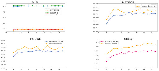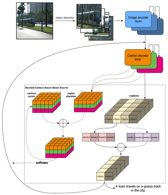 The models used include the image transformer (Trans) [18], which utilizes a transformer architecture to convert images into descriptive text, and the meshed-memory transformer () [19], which enhances the former by incorporating memory mechanisms for better context understanding. The attention on attention (AoA) [43] model improves the focus on important image areas by refining the attention mechanism, while the dual-level collaborative transformer (DLCT) [20] employs two levels of attention to balance global and local details in captions. Lastly, the beyond a pre-trained object detector (BPOD) model [44] leverages a cross-modal context to generate captions that consider both visual and textual information, not just detected objects. By applying these models, we assessed how different decoding strategies impact the quality of the generated captions.