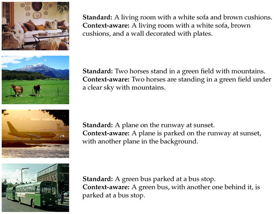 When generating a caption, the context vector is first normalized by applying a softmax function, as shown in Equation (2). The normalized context vector () is then combined with the image feature vectors and the partially generated caption sequence, which are all input into the model together, as described in Equation (3). This approach ensures that the context is consistently accounted for during the generation process, allowing the model to produce more coherent and contextually relevant outputs. The normalization of the context vector helps maintain a balanced influence of different contextual elements, leading to more accurate predictions and improved caption generation quality: