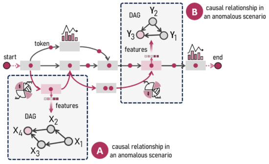Approaching this analysis from a causal perspective establishes the directed acyclic graph (DAG) as a key tool for understanding the connections between variables [8,9], as DAGs not only aid in identifying the causes of anomalous events but also provide a more comprehensive understanding of the operational interactions within the process. Nevertheless, their implementation demands a deep understanding of causal topology. In Figure 1, the DAGs from scenarios A and B reveal different levels of complexity, where, within the same process, the operational aspects of two distinct activities are represented by the variables and , respectively. Both significantly influence the overall flow, as their interactions can determine both the stability and performance of the process, potentially leading to anomalous scenarios in the business process flow.