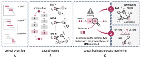 CaProM has three stages. First, process events are collected and recorded from project plans, reflecting flow instances that will be executed in the business process. Second, causal learning is carried out by constructing independent directed acyclic graphs (DAGs) for each process activity, which represent the dependencies between variables. Third and finally, these DAGs are used to monitor the process, detecting anomalies and critical nodes, based on techniques [10,11].