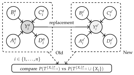 The next step involves comparing the marginal distributions before and after the replacement, specifically versus . Here, T represents the set of nodes considered in the analysis, and represents the variables of interest whose distributions are being measured. The notation indicates the inclusion of the distribution of with a set of distributions of , where is a new variable or a modification of an existing variable, being evaluated to see how its inclusion or change affects the distribution of the variables of interest.